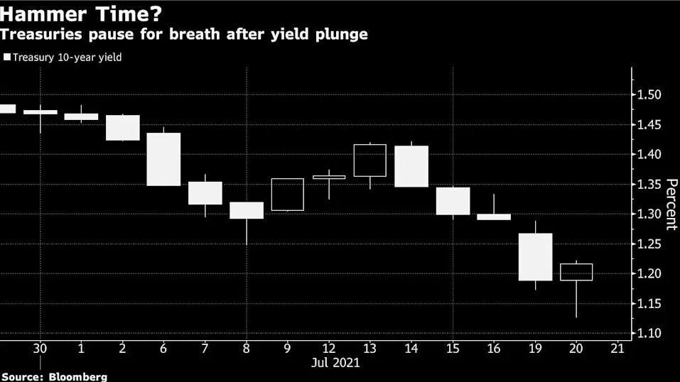 美債早前的上漲是由於對Delta病毒變種的擔憂日益加劇,10年期美債收益率在短短一周內就暴跌了近30個基點,目前兩年和10年期美債收益率差仍低於100基點,反映出對經濟增長的擔憂持續存在,7月初這一息差為122個基點。
