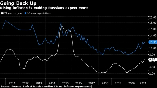 今年6月,俄羅斯的年通脹率已加速至6.5%,是近五年來的最高水平。根據該央行的調查,通脹預期已飆升至11.9%。葵花油和糖等關鍵原料的價格比去年上漲了65%或更多,用於包裝的塑料和紙的成本也翻了一番。俄羅斯央行表示,可能要到明年下半年才能使通脹回歸到目標水平。
