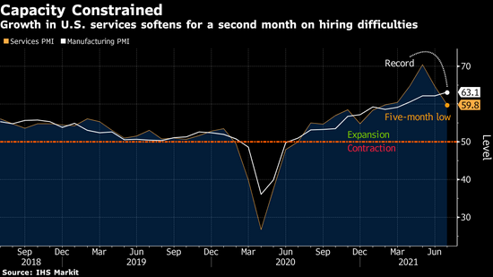 週五公佈的數據顯示,IHS Markit服務業採購經理人指數從一個月前的64.6降至59.8。雖然該指數自5月份飆升至紀錄高位以來已經走軟,但仍處於歷史高位。讀數高於50表明服務業擴張。