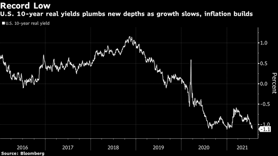 由於對經濟增長前景的擔憂加劇,美國10年期國債實際殖利率跌至歷史新低。