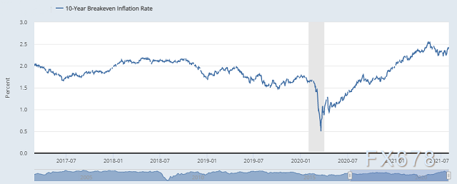 長期通膨預期也與美國聯準會的政策前景密切相關,每當美國聯準會似乎需要更長的時間來收緊貨幣政策、縮減購債規模並提高利率時,通膨預期通常都會上升。就在過去幾天,10年期盈虧平衡利率小幅走高,此前美國聯準會主席鮑威爾表示,美國聯準會尚未就何時開始縮減購債規模做出決定,且在結束縮減之前不太可能升息。