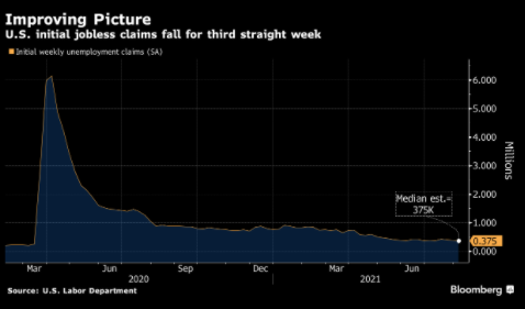 美國首次申請失業救濟人數連續第三週下降,進一步增添勞動力市場復甦的跡象。
