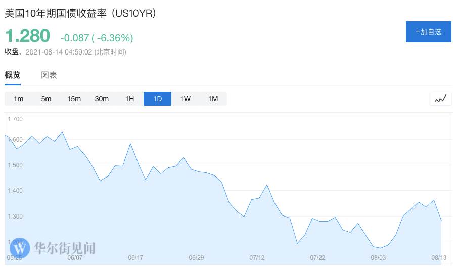 8月6日,在強於預期的7月份非農就業數據公佈後,10年期美國國債收益率一度從6個月低點反彈,但目前反彈趨勢已經停止,收益率降至1.3%左右。