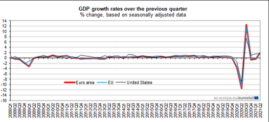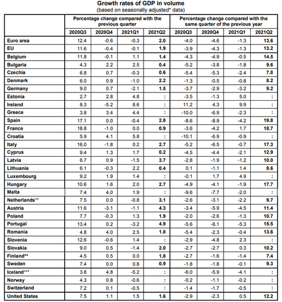 與去年同期相比,今年第二季度,歐元區經調整後的GDP同比增長了13.6%,歐盟增長了13.2%,而上一季度歐元區和歐盟的GDP均下降了1.3%。