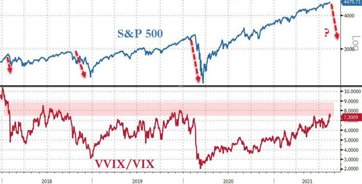 從歷史上看,VVIX和VIX的比率不會持續高企,當比率回落時,市場恐慌指數會飆升。”