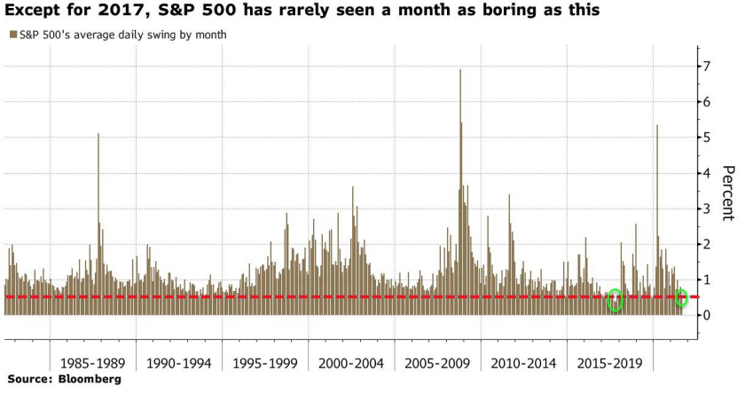 本週二之前,市場經歷了兩年來最平靜的一個月。儘管A股走勢疲軟,對德爾塔毒株的擔憂蔓延,且阿富汗局勢動盪,美股卻仍在高位浮動。然而,在平靜的表面下,焦慮卻在暗流湧動。