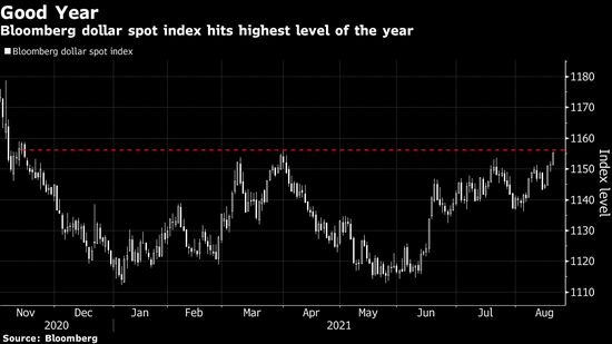 一項衡量美元走勢的指標升至去年11月以來最高水平,因市場擔心德爾塔變種新冠病毒可能威脅全球經濟復甦。
