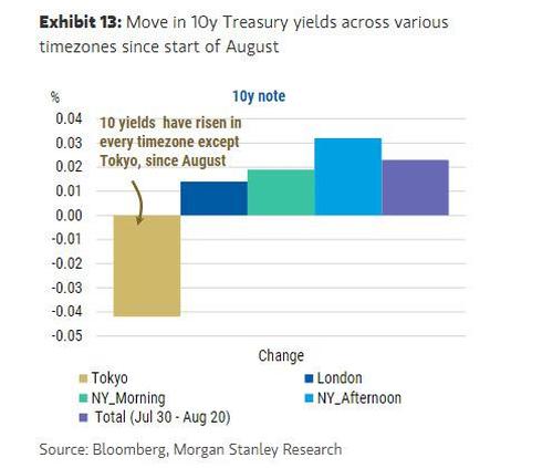 8月份迄今,美債收益率其實僅僅在東京交易時段出現了下跌,而在倫敦和紐約交易時段則上漲。
