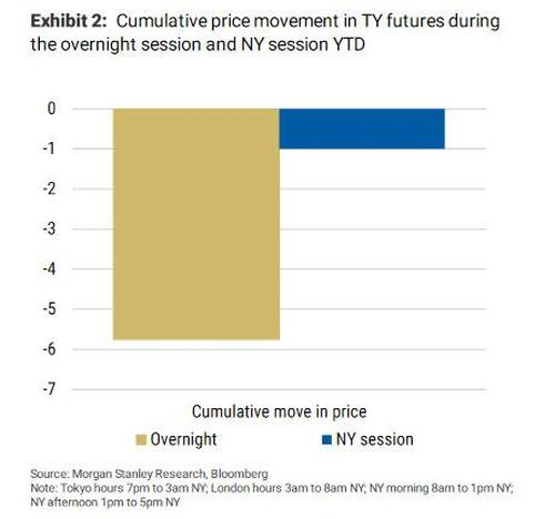 此外,上述的詭異景象甚至不光光出現在債市,美股的股指期貨也有相似的行情反差:過去一個月,標普期貨在隔夜時段下跌了4%,而從當地時間上午9點30分到下午4點的美股交易時段卻上漲了3.5%。 這與以往人們熟悉的「隔夜期貨上漲」模式截然相反。 過去10年,美股的大部分漲幅都是在這一模式下發生的。