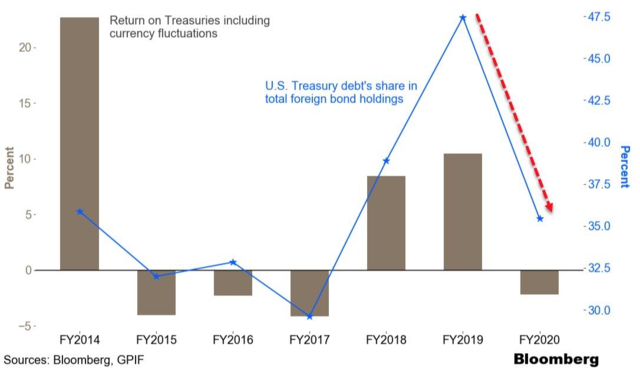 這一猜測在幾個月後得到了部分證實——本月早些時候公佈的數據顯示,全球最大的養老基金日本政府退休養老金(GPIF),在截至今年3月的上一財年內,所持有的美國國債和國庫券比例出現了創紀錄下滑,由此前的47%削減至了35%。