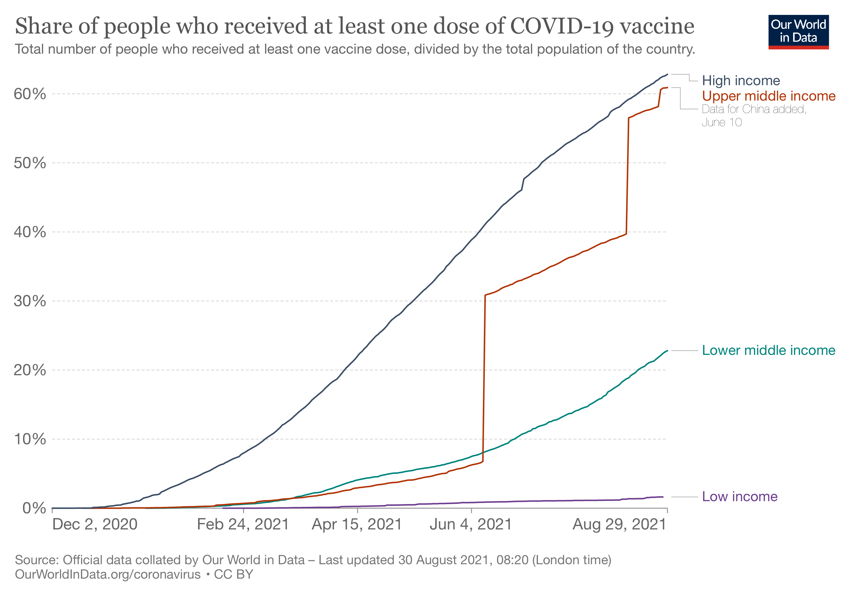 根據Our World in Data網站數據顯示,截至8月29日,全球人口的39.7%已接種至少一劑新冠疫苗。其中,高收入國家和較高中等收入國家接種一劑疫苗人口比例分別達到62.6%和60.9%;較低中等收入國家接種一劑疫苗人口比例為22.6%;低收入國家中接種一劑疫苗人口比例僅為1.6%。