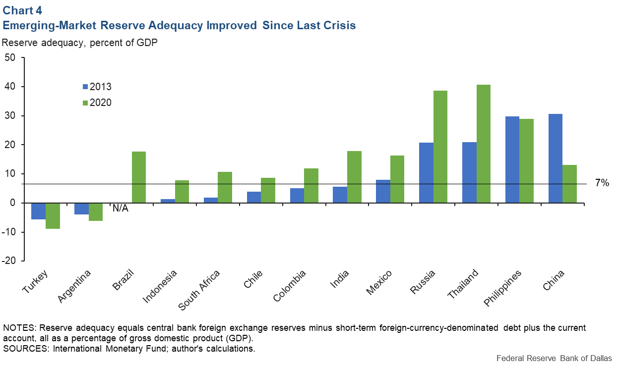 達拉斯聯準會的經濟學家戴維斯測算顯示,2020年第四季度主要13個新興市場經濟體外匯儲備充足,除土耳其和阿根廷外,均能較好抵禦美國聯準會的加息風險。
