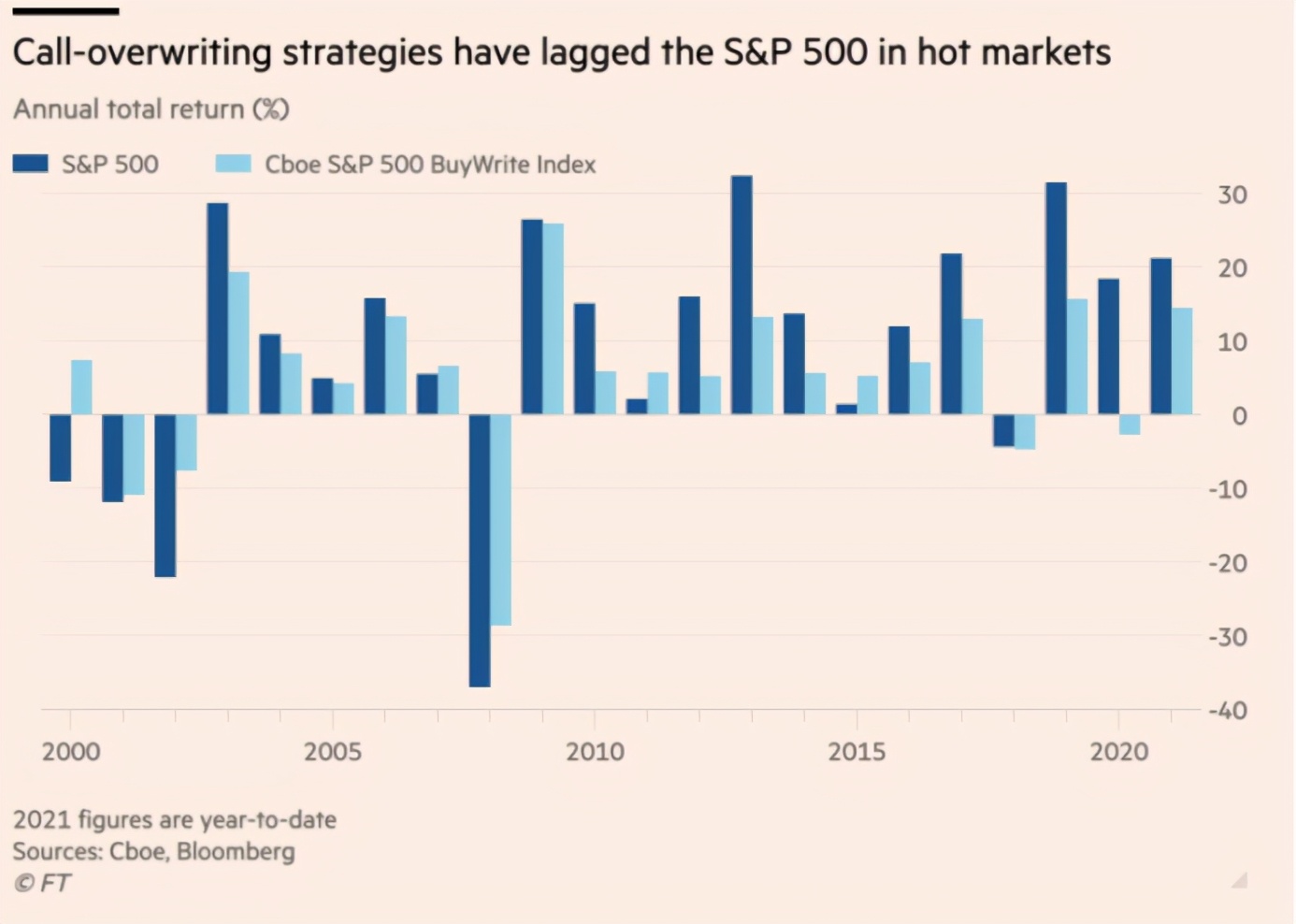今年,這一策略落後于整體股市。儘管標普500指數的回報率已超過20%,但芝加哥期權交易所的標普500備兌開倉策略指數的漲幅較小,僅爲14.5%。