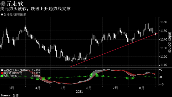 技術圖暗示美元還有進一步下跌的空間。彭博美元即期指數跌破了6月和8月低點所形成的上升趨勢綫支撑位,MACD和隨機指標等技術指標顯示美元勢頭疲軟。
