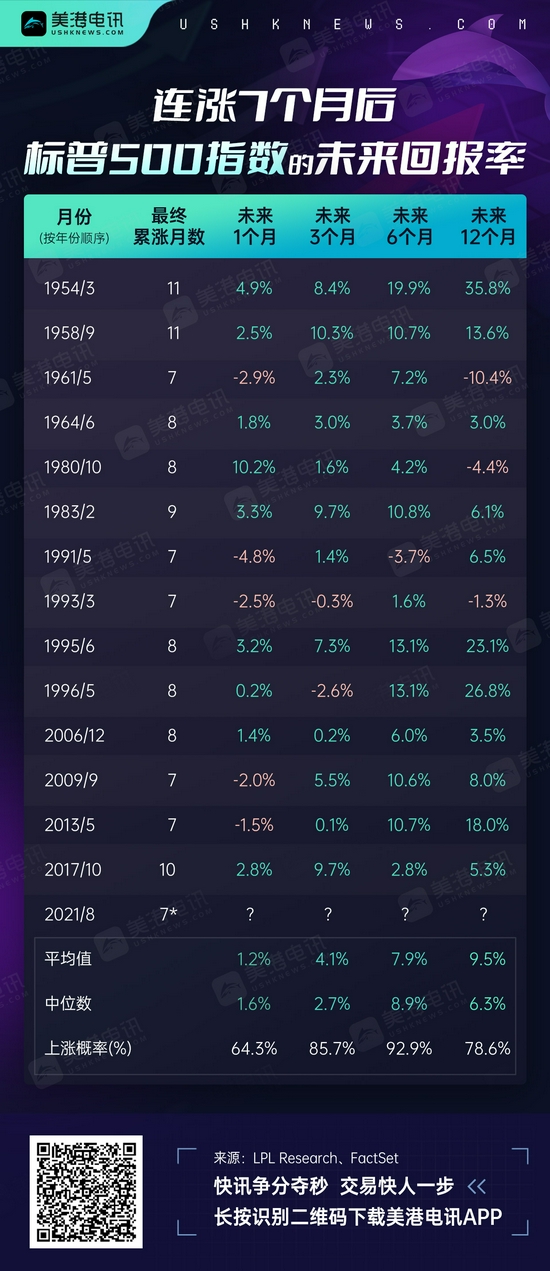 LPL Financial首席市場策略師Ryan Detrick表示,持續數月至今的收益或為未來3個月、6個月和12個月的市場表現提供更好的參考。根據過往資料,當標普500指數至少7個月連漲後,此後3個月、6個月和12個月的平均收益分別為4.1%、近8%和9.5%。