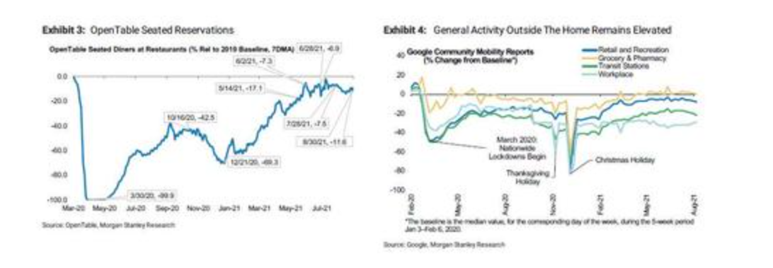 此外,在高頻資料中還可以看到另外兩個樂觀的跡象,這些資料“也表明了健康的流動性水準”。舉個例子,OpenTable外出就餐略有放緩,但與6月以來的情況基本一致(圖表3)。穀歌(2895.5, 11.12, 0.39%)追蹤到的家庭外的一般活動已經平緩,但仍在上升(圖表4)。