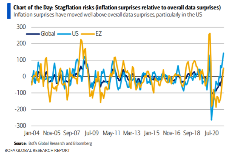 美銀的圖表觀察了包括美國和歐元區在內的全球經濟,顯示“通脹的意外遠高於整體資料意外”,而在美國尤其如此。