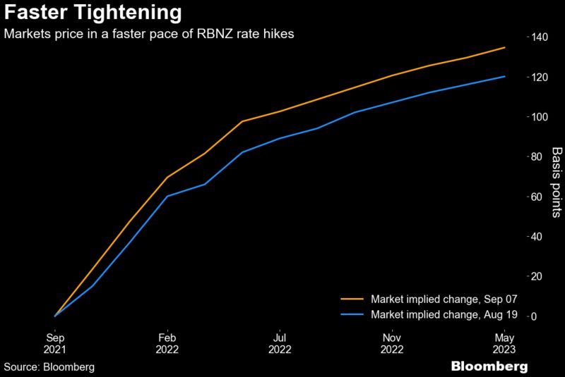 紐西蘭聯儲(Reserve Bank of New Zealand)在逐步退出經濟刺激措施方面走在了大多數發達經濟體的前列。該國在7月份結束了債券購買計畫,市場預期紐西蘭聯儲可能在明年年底前將利率上調逾100個基點。