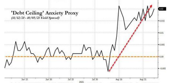 如下圖所示,債券市場的價格扭曲越來越明顯,美國2021年10月5日和11月12日到期的短期國庫券之間的收益率差不斷擴大,這一時期剛好就是債務上限問題出結果的最後期限。