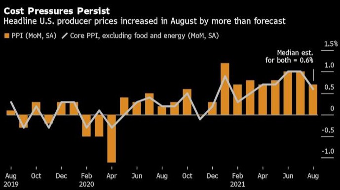 美國勞工部(Labor Department)周五表示,美國8月PPI同比上漲8.3%,創2010年11月以來新高;前值爲7.8%,預期爲8.2%。美國8月PPI環比上漲0.7%,前值爲1%,預期爲0.6%。