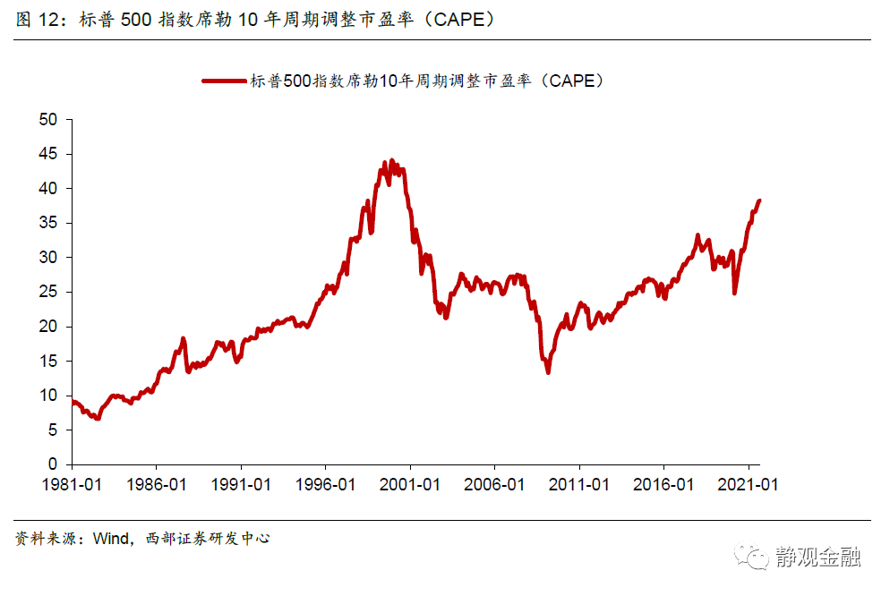 貨幣政策收緊僅是美股的波動因素,但對於高估值美股而言Taper仍存利空。2013年美國聯準會宣佈削減QE之際美股估值仍處於歷史分位數的低位,反而削減QE過程還引發了股債蹺蹺板效應。在2013年5月22日伯南克給出Taper信號後的一個月內標普500小幅調整後反而大漲,2013年甚至是金融危機後美股表現最好的一年。換言之,2013年在削減QE的預期下金融機構將資金從美債市場轉向了低估值的美股,這種蹺蹺板關係也加劇了美債的調整。由此可見,Taper對於股市而言僅是波動因素。但是由於目前美股估值極高,因此本次Taper對美股仍然存在一定利空。2013年標普500指數10年席勒週期調整市盈率均值僅為23.2倍,2021年9月已經升至38.3倍,為僅次於2000年納斯達克(15105.5821, -9.91, -0.07%)泡沫破滅前的歷史次高水平。