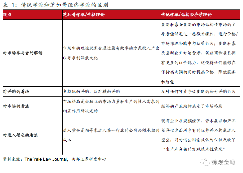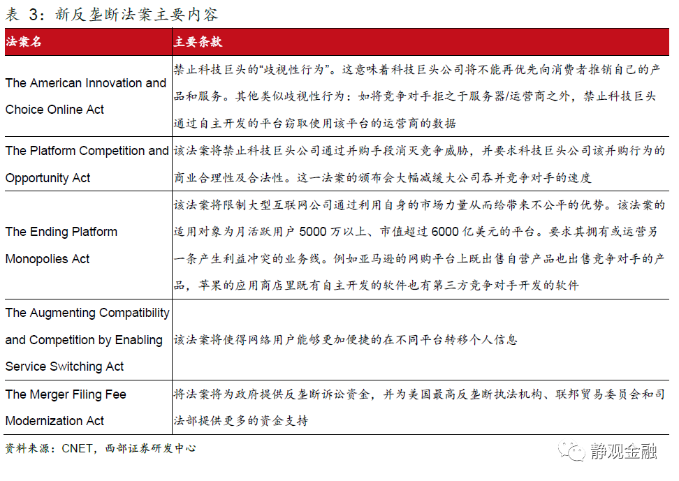 從美國國會目前公佈的信息,目前新反壟斷提案針對目標主要為市場規模較大、市值較高的互聯網公司,主要包括FAAG(美國四大科技公司蘋果、谷歌、Facebook(376.51, -2.18, -0.58%)和亞馬遜(3457.17, -11.98, -0.35%))、網飛(Netflix(589.29, -9.43, -1.58%))和推特(59.66, -1.90, -3.09%)(Twitter)等。如下表所示,一些法案開始對大型科技公司的壟斷性競爭策略:如利用旗下平台的主導地位來推廣自身其它業務並排斥其他競爭者,多元化併購等作出了明確的限制,這在之前的反壟斷法框架之下都是史無前例的。透過現象看本質,新反壟斷法案的出台也同時標誌著對反壟斷法解讀的改變。如前文所述,二戰以來美國的反壟斷法一直在被芝加哥經濟學派的思想所左右。這次新反壟斷法案的提出,標誌著對反壟斷法的目的的認知,由曾經的“最大化消費者福利”轉變為了“維護正常的市場秩序和市場參與者之間的良性競爭關係”。