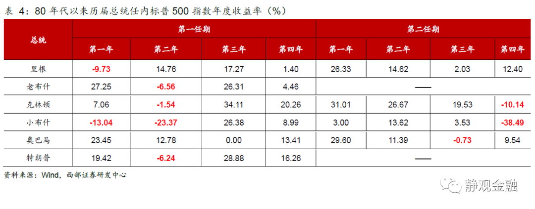 在美國總統連任是大概率事件。1932年以來美國共經歷了14位總統執政,除肯尼迪總統在其第一任期遇害外只有四位總統未能獲得連任,分別是福特總統(任期為1974-1976年)、卡特總統(任期為1977-1980年)、老布什總統(1989-1992年)以及川普(2017-2020年)。其中,福特是在水門事件後以副總統身份接替尼克松的非民選總統,未能連任實屬正常;老布什與其前任裡根均來自共和黨,一黨連續12年執政也比較罕見。儘管後人對於卡特敗選給出很多理由,但我們認為卡特總統敗選以及裡根當選剛好是美國政治光譜右傾,民主黨影響力減弱、共和黨執政影響力上升的標誌。川普敗選和拜登當選亦然。