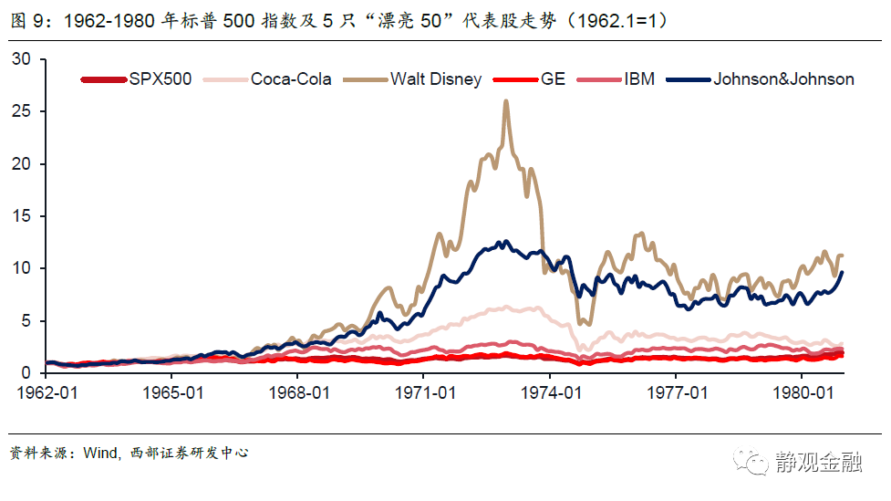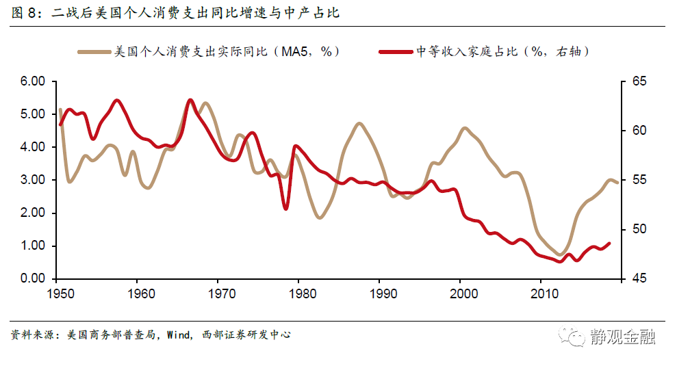 中產佔比將較大程度影響居民部門的整體消費能力,如圖8所示,上世紀50年代以來美國個人消費支出實際同比與中等收入家庭佔比幾乎同向波動。回頭看,以漂亮50為代表的美國消費股牛市之所以始於60年代,大概率亦與中產佔比上升消費能力增強有關。由此可見,當美國社會開始追求公平、民主黨政治影響力上升、中產佔比提高的階段,美國股市風格可能也會偏向消費相關。當然,由於無風險利率潛在的上升趨勢,也意味著股市難以持續獲得估值紅利,多數依靠業績驅動。
