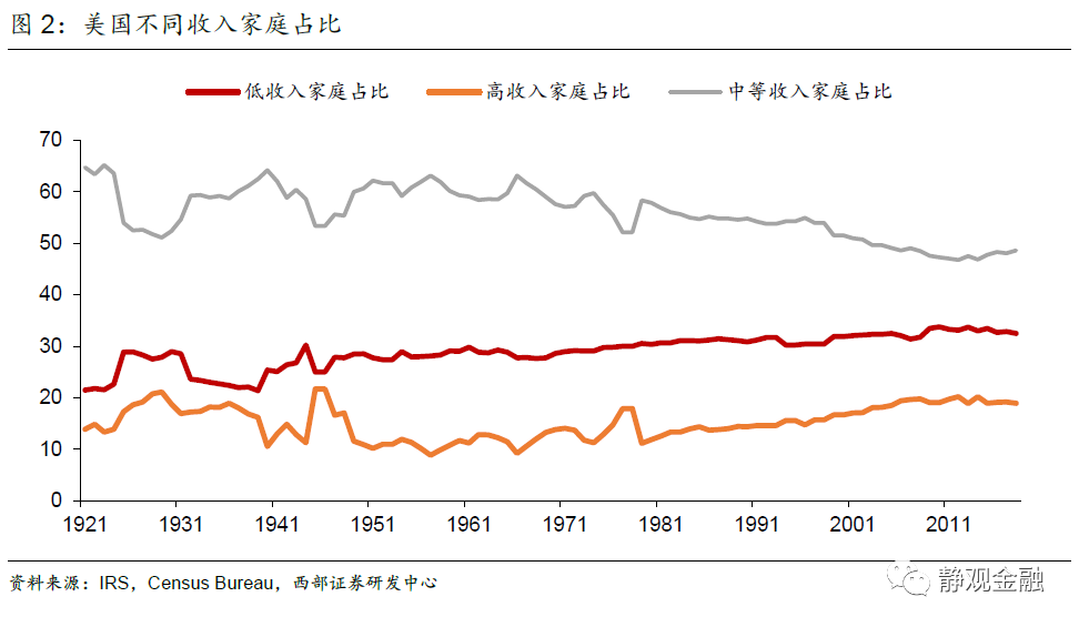 事實上,美國社會結構是驅動兩黨執政影響力交替的關鍵因素。民主黨執政理念偏向“大政府”、代表“公平”,善於通過加稅方式利用二次分配降低貧富分化;共和黨推崇“小政府”的執政理念、代表“效率”,善於通過減稅、降息方式推動資本逐利。一戰後至疫情前美國有兩次對於“公平”和“效率”的再選擇,分別出現在大蕭條後以及1980年裡根當選後。大蕭條時代美國貧富分化形勢極其嚴峻,社會矛盾推動美國社會進入了“公平”理念主導階段,美國政治光譜開始左傾、民主黨政治影響力上升。隨後,美國始終處於加稅週期,剔除二戰帶來的政府槓桿率被動上升階段外,1933年-1980年美國政府槓桿率整體偏低,且社會結構不斷優化。物極必反,1980年美國社會結構呈現“橄欖型”後公平理念也就走到了極致,美國社會重新進入由“效率”主導階段,美國政治光譜開始右傾、共和黨政治影響力上升。此後,美國進入降稅週期,政府槓桿率上升的同時,中產佔比開始下降、貧富分化重現惡化。