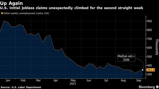 勞工部周四公布的數據顯示,在截至9月18日的一周,首次申請失業救濟人數升至35.1萬人,彭博調查經濟學家預估中值爲减少至32萬。