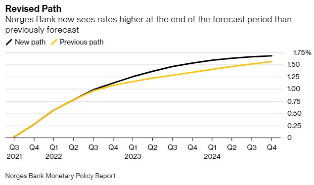 挪威央行周四的舉措是全球貨幣政策關鍵一周中的一個亮點。全球至少有15家央行表示將針對不同階段的復蘇和相關通脹上升做出反應。在挪威采取行動的前夕,巴西央行將利率提高了整整一個百分點;而此前的FOMC會議中,美聯儲表示可能很快開始縮减債券購買規模。該加息决定公布後,挪威克朗兌歐元報10.0756,此前曾觸及三個月來最高水平。