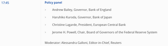 其中,英國央行行長貝利、日本央行行長黑田東彥、歐洲央行行長拉加德、美聯儲主席鮑威爾將于歐洲當地時間今日17:45(北京時間週三23:45)同場發表講話。四大央行掌門人“線上聚首”的盛景,堪稱年內罕見。