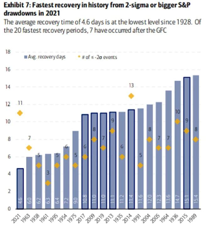 在美股基準股指9月20日暴跌後,隨後又在上周快速反彈,這和今年此前的指數表現非常思相似。從資料來看,今年標普500指數每次從大幅下跌後快速反彈的情況(被美銀稱為2σ事件)出現了11次,平均每次只需要4.6天,而這是美銀自1928年開始統計以來的最快資料。