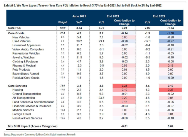 這可能將核心PCE指數推高105個基點,高盛目前預計,到2021年底,這一類別的貢獻將升至115個基點,到2022年底將收縮至-75個基點。