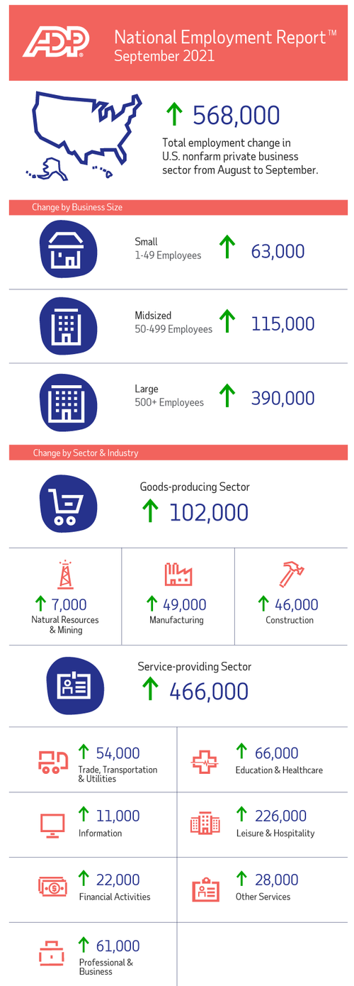 原標題:美國9月ADP就業人數增加56.8萬人 高於預期