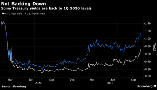 美債收益率自美聯儲9月會議以來一直走高,因會議凸顯出圍繞利率最快明年上調以應對通脹加劇的預期升溫。美國利率期貨交易員目前對於6月加息25個基點的概率為50%。