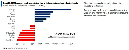 在美國銀行本月調查中,銀行股配置最高,基金經理的超配程度達到2018年以來最高水平。能源股超配程度高於2012年以來任何時候。