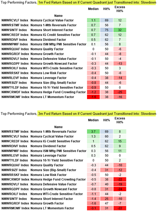 這對股票回報有重大的影響。根據McElligott對之前進入“放緩”階段的案例進行的回測,有一些反直覺的結果——因為“價值”(週期性和防禦性價值)與“增長”和其他因素(動量、擁擠、低風險、規模)相關。然而,10年期美債收益率敏感因素和WTI原油敏感因素實際上也滯後了,這與看漲的“價值”交易行為形成了驚人的對比……