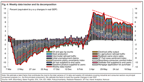 野村美國經濟團隊的每週實際GDP跟蹤也證實了這一點,報告顯示經濟在快速增長後顯著減速。