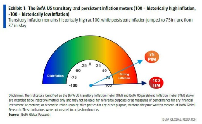 然而,一個月後,一個不祥的趨勢出現了:儘管“暫時性”通脹讀數依然是100,但“持續性”通脹在6月份翻了一倍至75。