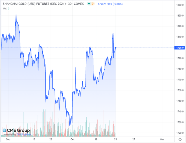 但令人困惑的是,在通脹指標持續上行之際,作為傳統對沖通脹工具的黃金卻表現不佳:芝商所(CME)上海黃金合約在美國9月CPI資料公佈後一度下挫50美元。
