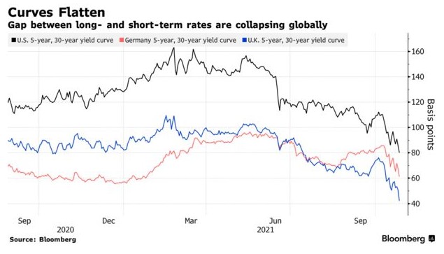 由於各大央行著手準備調整或取消寬鬆政策,短期和長期債券收益率的差距不斷縮小。 其中,由於英國削減債券發行規模,英國30年期國債收益率正以2020年3月以來最快的速度下挫,同時,美國30年期國債收益率也出現下降11個基點。