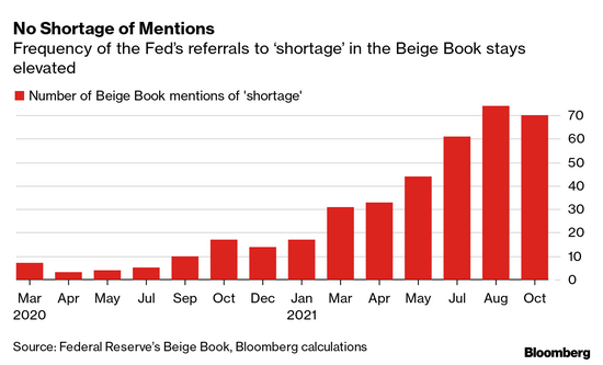 美國聯準會最近一次評估經濟時,12個地區聯準會銀行中,有十家表示對工人、原料或是商品的稀缺感到緊張。“短缺”一詞出現了70次,六個地區聯準會提到“瓶頸”,大部分稱“價格顯著高企”。
