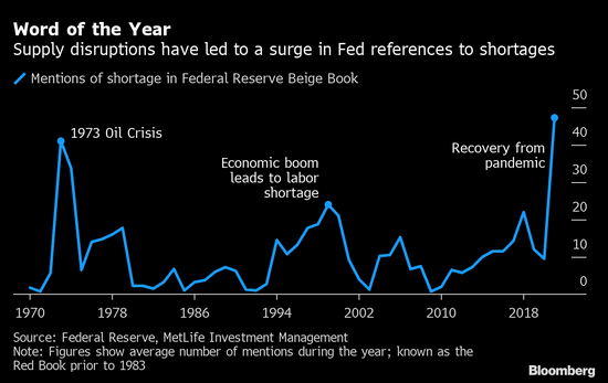 MetLife投資管理公司指出,總的來看,在褐皮書中“短缺”的出現頻率位於上世紀70年代初以來的最高水平附近。