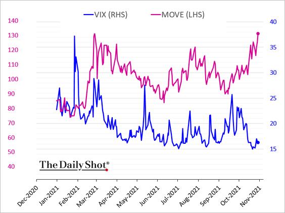 值得一提的是,儘管隔夜美債市場整體波動有限,但近期債券市場的隱含波動率指標依然與美股市場形成了鮮明反差,衡量美債隱含波動率的美銀MOVE指數近期已升至了今年3月的高位附近,而有著美股恐慌指數之稱的VIX指數則再度一路下探至了15左右的低位。
