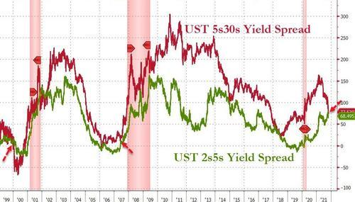 從美債收益率曲線看,知名財經博客網站Zerohedge指出,眼下5年30年美債收益率曲線部分正在趨平,而2年5年部分則正變得更為陡峭,在歷史上這兩條曲線出現類似收斂現象,往往伴隨著經濟衰退的發生。