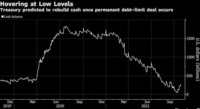 NatWest的預計的情況是,債務上限將在11月或12月初解決,這將使美國財政部在2022年將凈票據發行量提高約3000億美元,使其現金餘額回到約8000億美元。