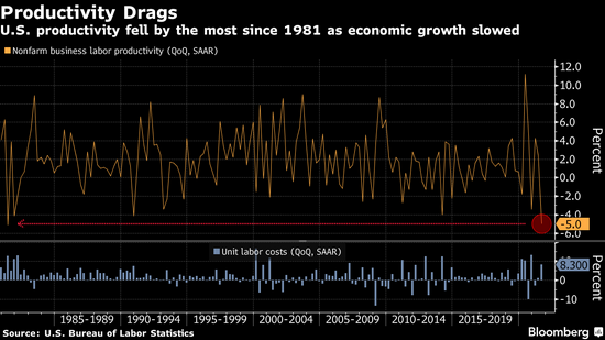 美國勞工部週四公佈的資料顯示,第三季度非農企業員工每小時產出折合年率下降了5%。相比之下,第二季度增長2.4%,而彭博調查的經濟學家的預期為下降3.1%。生產率數字經常非常不穩定。