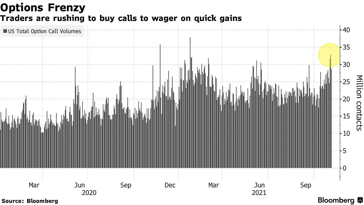 在2020年年底帶動美股實現大幅反彈的期權狂潮(options frenzy)似乎又回來了。 高盛(408.341.26, 0.31%, )彙編的數據顯示,由於交易員為了快速獲利而大舉進行投機性押注,上個月期權日均交易量達到 5,380 億美元,創下歷史新高。