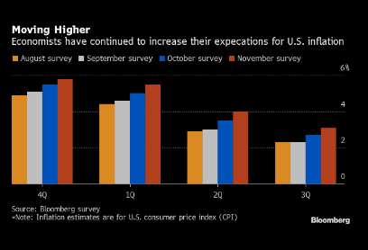 根據彭博的最新月度調查,47位受訪經濟學家預期中值是今年第四季度末CPI將同比上漲5.8%,高於一個月前預測的5.5%。 不過,有些經濟學家的預測是週三的CPI數據發佈之前提交的,而這份數據顯示10月CPI取得1990年以來最大同比漲幅。
